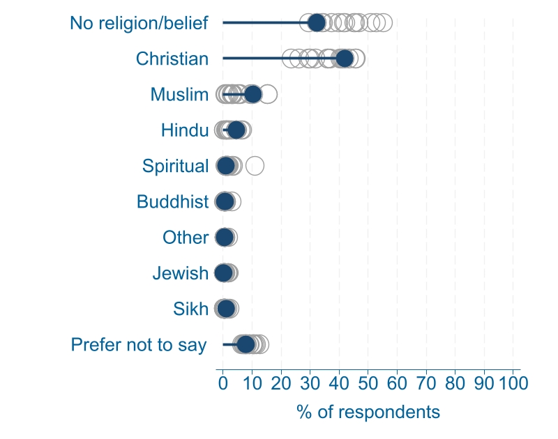 Religion or Belief Count % Count % Not recorded 0 0% 15 0% Recorded 27,380 100% 311,460 100% No religion 8,830 32% 128,260 41% Christian 11,475 42% 120,025 39% Muslim 2,825 10% 14,885 5% Hindu 1,240 5% 9,130 3% Spiritual 265 1% 5,810 2% Buddhist 175 1% 2,285 1% Other 130 0% 1,920 1% Jewish 25 0% 1,785 1% Sikh 280 1% 1,600 1% Prefer not to say 2,135 8% 25,760 8% 27,380 100% 311,460 100%